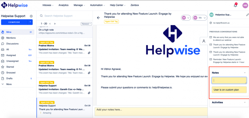 As you are already familiar with adding notes to a conversation in Helpwise, now you can add notes and activities to contacts as well. Team users can add internal team notes and other teammates can check how their other teammate handled the past conversations. You can also add custom activities for a contact.