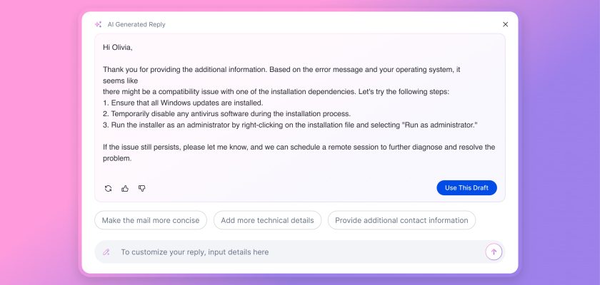When responding to emails, AI Reply analyzes the ongoing thread and references your knowledge base to craft contextual replies. Use the draft as-is, tweak it, or refine it with prompts and suggestions for concise, relevant responses.