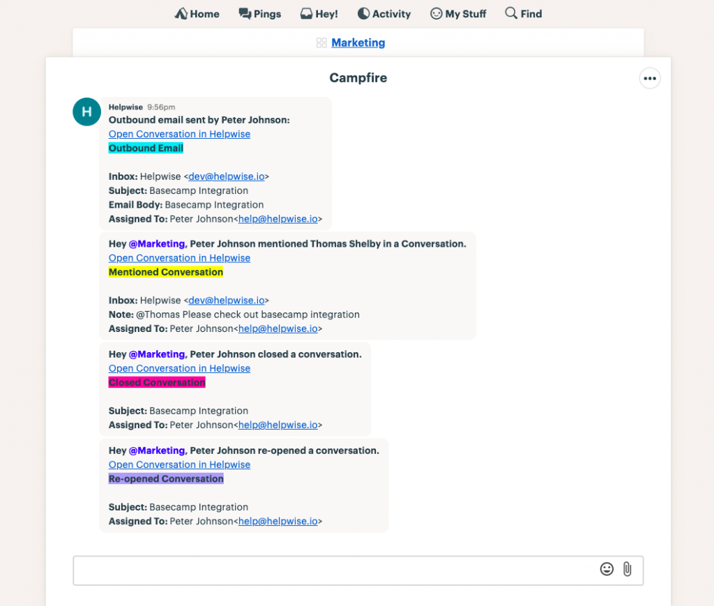 After successfully connecting your Basecamp account with Helpwise, the activities in your Helpwise account will be automatically sent to Basecamp chat. The messages in Basecamp show up in different color code scheme to different types of Helpwise events easily. Here is the list of activities that can be sent to Basecamp :