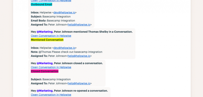 - Conversation state change: Helpwise will send a message to Basecamp when a conversation is either closed, unassigned, deleted, spam or re-opened. The closed message shows in Pink, unassigned in Orange, deleted in Red, spam in Green and re-opened in Periwinkle color.