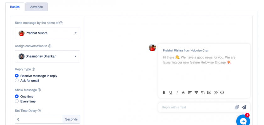 This field asks you to select the team members, on behalf of whom you want to show the message to your users or visitors. As shown in the image below, Helpwise will use “Curtis Jackson” name to send the engage.