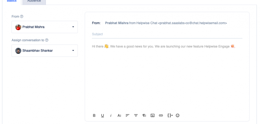 This is the most important field of the engage because it contains the content of the engage. Here you can type in the Subject of your Email and then type the content of the Email that you want to send to your contacts. To make the content more interactive, you can add inline images, emoticons, links, etc. You can even insert the variables to automatically add the First name, Email, etc of the recipient to make the Email more personal.