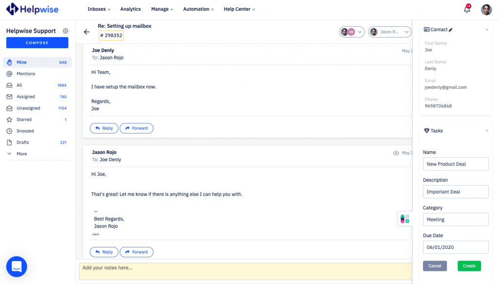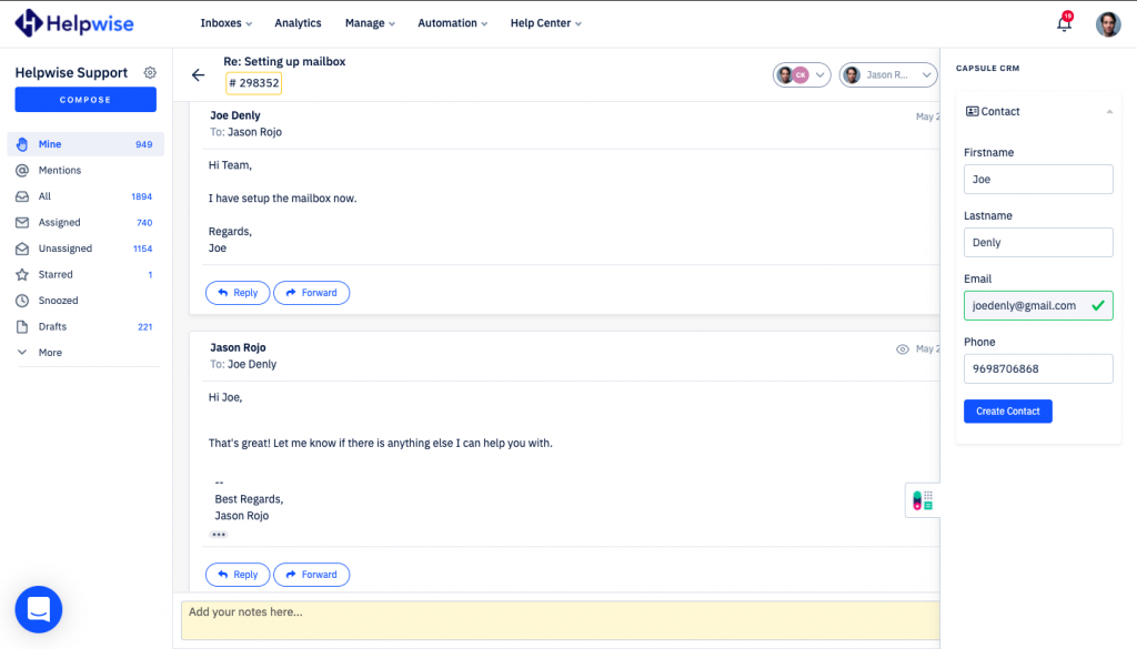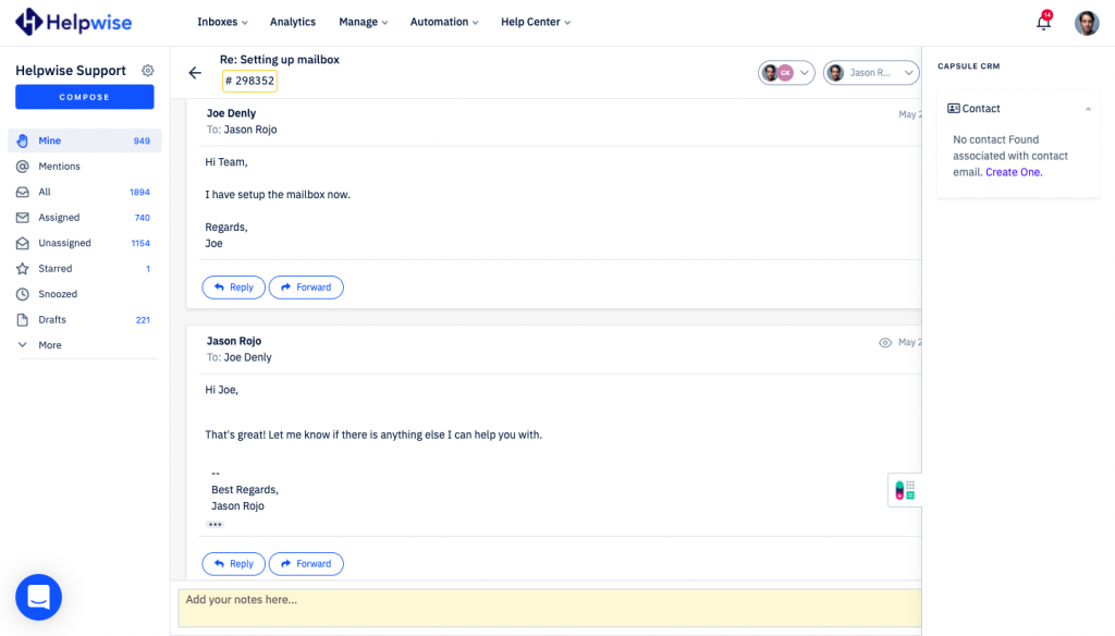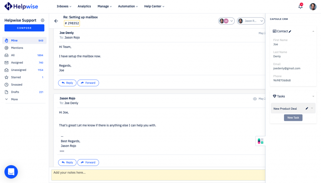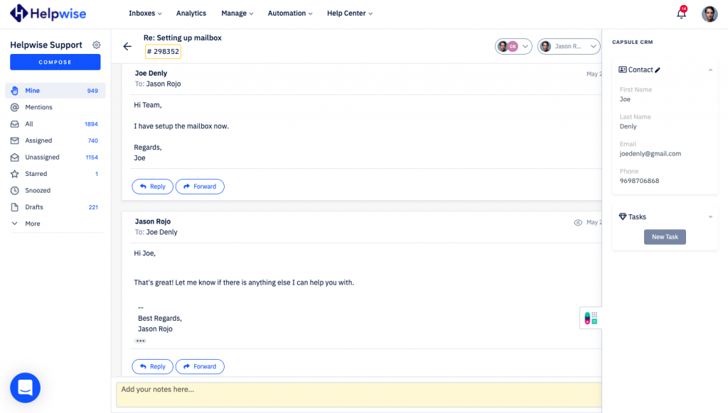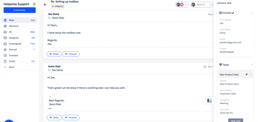 Helpwise now integrates with Capsule CRM, which helps team to manage contacts and tasks directly from the shared inbox.