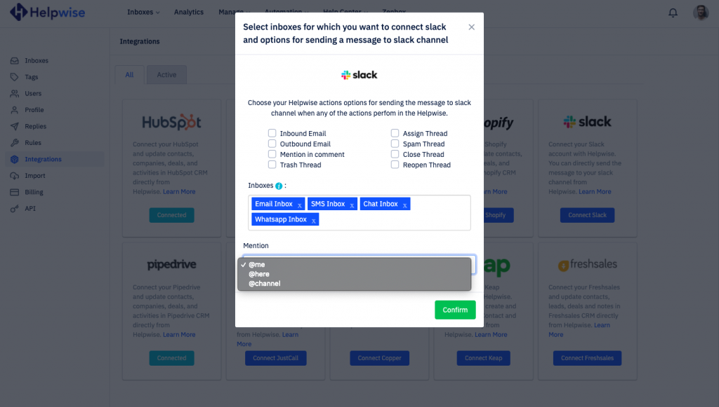 - After selecting the options, click on ‘Confirm’ button. That’s it, now you have connected a slack channel for more than 1 inbox.
